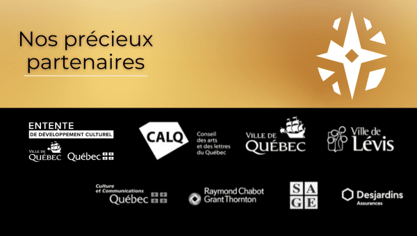 Culture Capitale-Nationale et Chaudière-Appalaches et les partenaires des Prix d’excellence des arts et de la culture tiennent à remercier la Ville de Québec et le ministère de la Culture et des Communications dont l’appui financier dans le cadre de l’Entente de développement culturel est essentiel à la tenue et au succès de l’événement. Ils remercient également les commanditaires Desjardins assurances, Sage courtier d’assurance, ainsi que Raymond Chabot Grant Thornton.