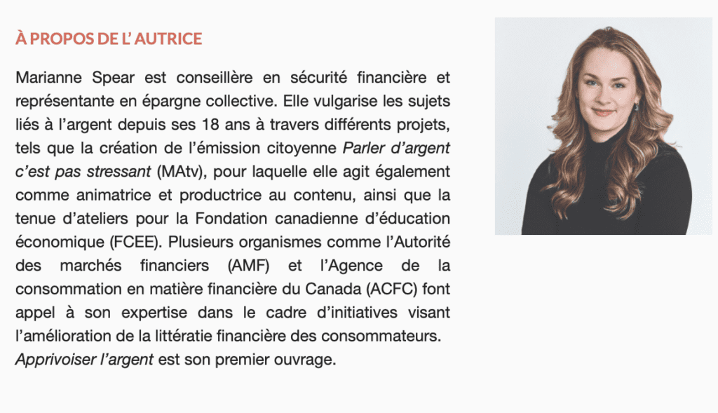 L’argent, c’est souvent stressant ! Dans ce guide hyper accessible, la conseillère en sécurité financière Marianne Spear rassemble tout ce qu’il faut savoir pour apprendre à mieux gérer notre argent et pour faire des choix qui sont en accord avec nos valeurs et nos objectifs.