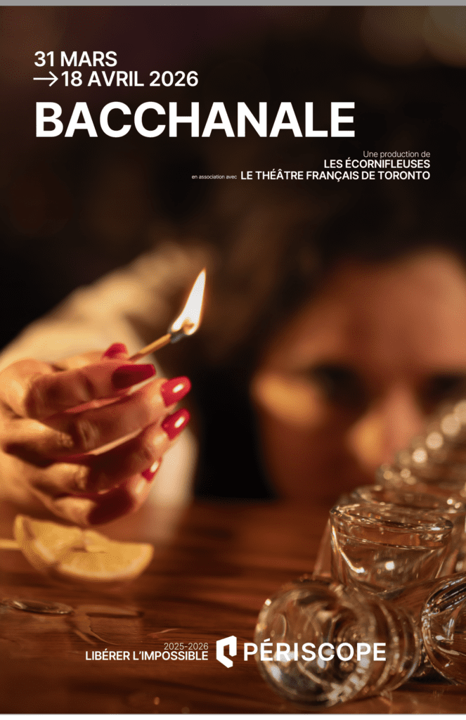 Six femmes qui tiennent leur rôle de serveuse, six générations qui se transmettent, dans la bienveillance et la confrontation, une révolte aussi vieille que le monde. BACCHANALE est une œuvre sur ce que les femmes portent, endurent et se lèguent. Une invitation à la purge, à la transe et à la libération collective. Du 31 mars au 18 avril, le Théâtre Périscope, Les Écornifleuses et le Théâtre français de Toronto invitent le public à découvrir cette pièce féministe de Olivier Kemeid, mise en scène par Frédéric Dubois. Dix-huit ans après leur collaboration pour la première mouture de cette pièce, les deux artistes se retrouvent et se joignent aux Écornifleuses pour porter à la scène une œuvre revisitée à la lumière des enjeux actuels. Avec une distribution entièrement féminine et intergénérationnelle mettant en vedette les talentueuses Aurélie Fortin, Marie-Hélène Lalande, Linda Laplante, Joanie Lehoux, Marie-Ève Lussier-Gariépy et Karine Ricard, Bacchanale marque une première collaboration interprovinciale entre Les Écornifleuses et le Théâtre français de Toronto.