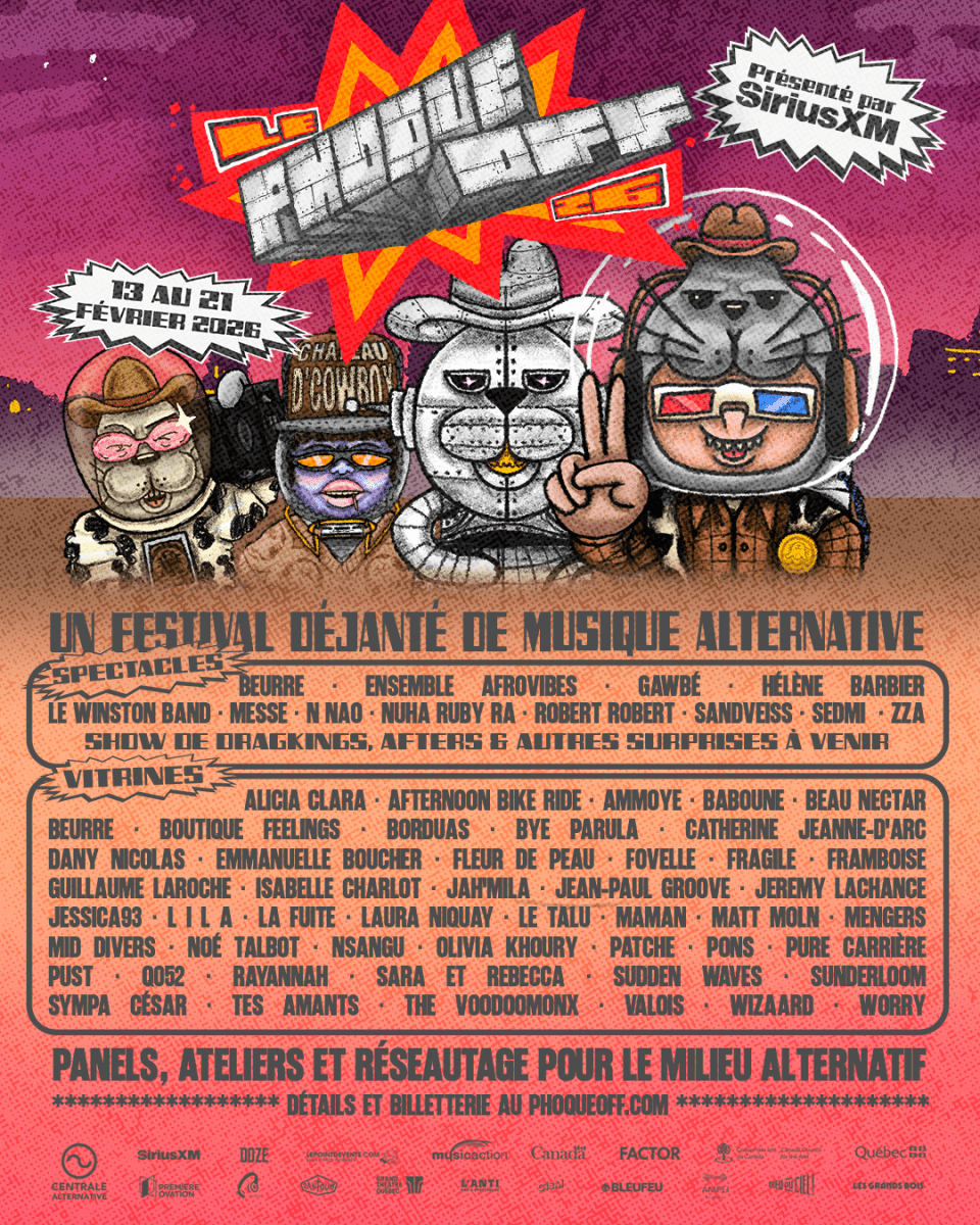 Présenté par SiriusXM, le festival déjanté de musique alternative Le Phoque OFF dévoile une programmation audacieuse incluant des spectacles et des vitrines ouvertes au public ainsi qu’un riche volet dédié aux artistes et aux professionnel·les du milieu musical. Du 13 au 21 février 2026 dans la féerique ville de Québec, c’est près de 100 artistes qui seront mis en lumière lors… Poursuivre la lecture Le Phoque OFF dévoile sa programmation 2026!- du 13 au 21 février –