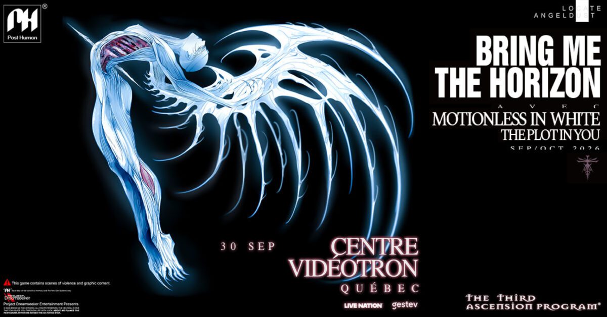 Bring Me The Horizon, groupe nominé aux BRIT et aux GRAMMY Awards et aux multiples disques de platine, annonce aujourd’hui POST HUMAN : NeX GEn – The Third Ascension Program, une nouvelle tournée nord-américaine d’envergure en tête d’affiche qui marque la prochaine étape de son expérience scénique emblématique. Avec neuf dates réparties entre le Canada et les États-Unis, dont un arrêt au Centre Vidéotron, à Québec, le 30 septembre prochain, cette tournée scelle les premiers concerts du groupe depuis près de 15 ans dans certaines villes de l’Ouest canadien, un retour tant attendu qui souligne l’engouement mondial pour l’un des groupes les plus avant-gardistes et les plus influents de sa génération sur le plan culturel. Motionless in White et The Plot in You assureront quant à eux les premières parties des concerts.