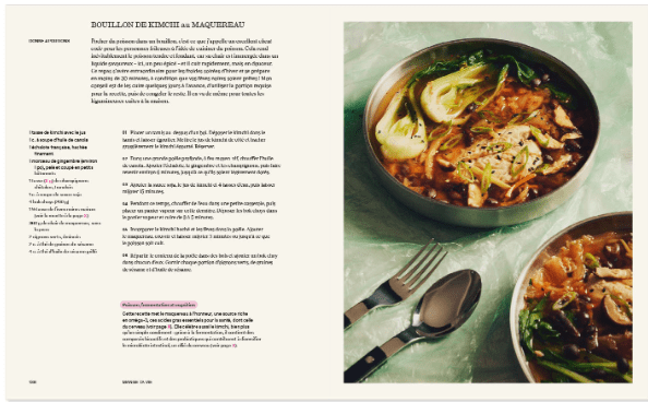 Au menu, des astuces brillantes et des recettes inspirées qui visent à rehausser notre quotidien sous le signe du plaisir et de la simplicité: falafels, yogourt aux herbes et radis poêlés, galette rustique aux abricots, carpaccio de saumon et salade d’orge perlé mousse au chocolat et à l’huile de noisette, bouillon de kimchi au maquereau, etc.