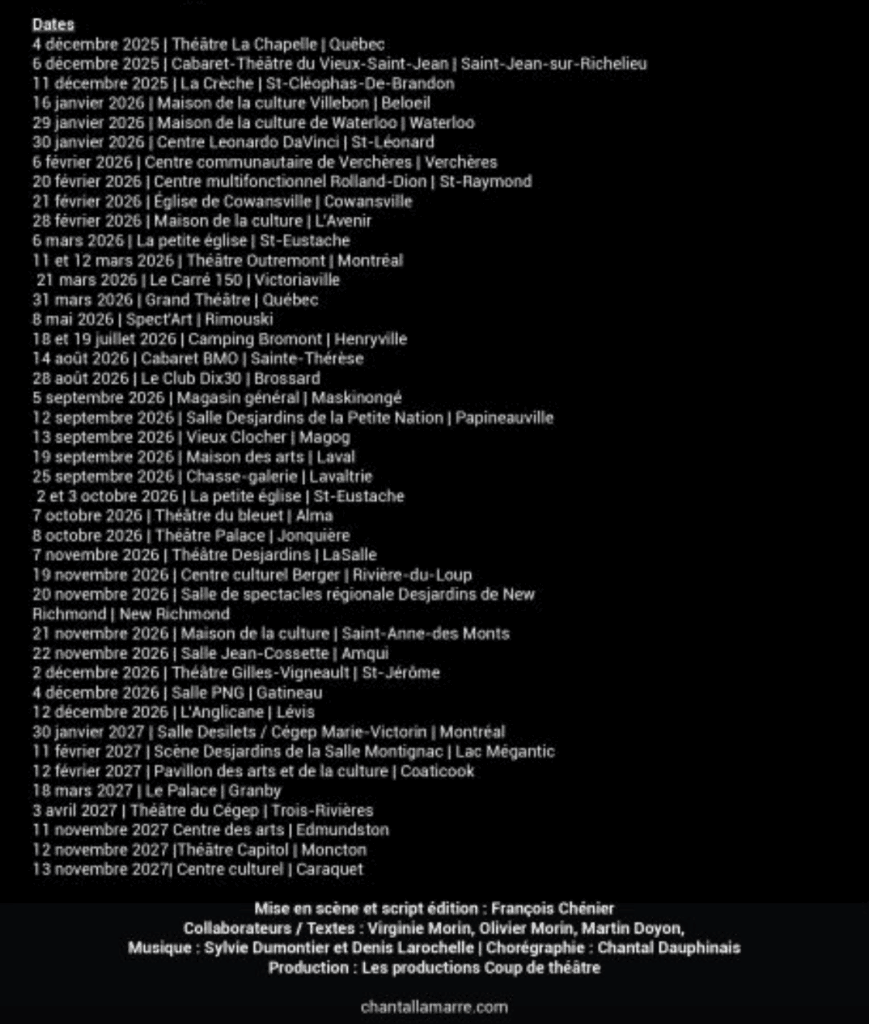Elle sillonne les routes du Québec depuis l’été dernier et y présente ce qu’elle qualifie de joyeux cabaret bio-comique. L’aventure de Steppettes et cornemuse, le premier spectacle solo de Chantal Lamarre se poursuit de belle façon avec l’annonce de 32 nouvelles dates de présentation.