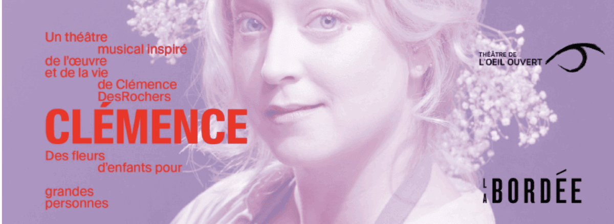 Le Théâtre de l’Oeil Ouvert est fier de présenter le spectacle musical original Clémence : Des fleurs d’enfants pour grands personnes, inspiré de l’œuvre et de la vie de Clémence DesRochers, du 10 au 14 décembre au Théâtre La Bordée. Ce spectacle, porté par Jade Bruneau, Simon Fréchette-Daoust et Marc-André Perron au piano, est une plongée poétique et musicale dans l’univers de Clémence. À travers ses textes et ses chansons, elle célèbre une parole toujours actuelle, empreinte d’espoir, de nostalgie et de tendresse.