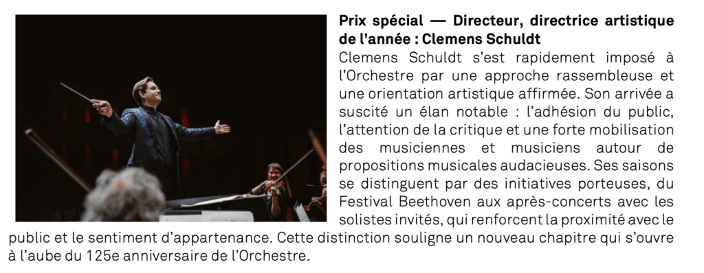 L’Orchestre symphonique de Québec est honoré de recevoir deux prix OPUS, soulignant à la fois la vision artistique de son directeur musical et l’excellence d’un concert phare de la saison 2024-2025.