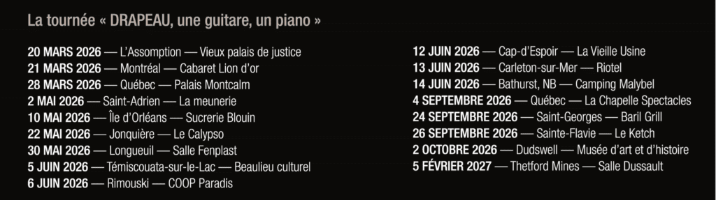 Afin de souligner la sortie de l’album, Étienne Drapeau présentera une rentrée montréalaise le 21 mars 2026 au Cabaret Lion d’Or à Montréal et il prendra ensuite la route avec une nouvelle tournée. Lors de ce spectacle intime, l’artiste s’accompagnera à la guitare, au piano et a l’harmonica, revisitant ses plus grands succès dont plusieurs chansons ayant atteint le numéro 1 des palmarès radio -tout en dévoilant les nouvelles pièces de cet album.