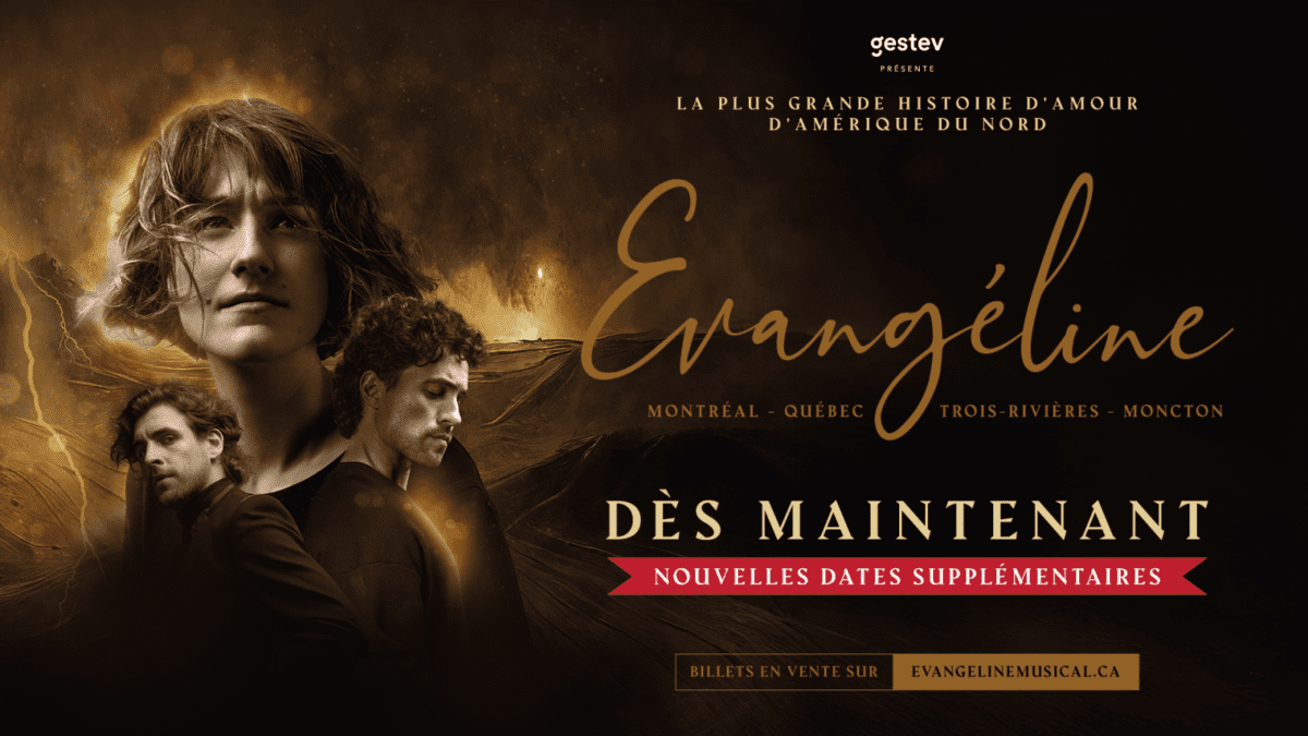 S’annonçant comme l’un des grands rendez-vous culturels de 2026, le spectacle musical Évangéline dépasse désormais le cap des 30 000 billets vendus et l’engouement est tel que Gestev annonce aujourd’hui, à quelques jours à peine de la première mondiale, pas moins de neuf supplémentaires du grandiose spectacle musical, soit cinq à la Salle Wilfrid-Pelletier de la Place des Arts à Montréal et quatre autres au Grand Théâtre de Québec. Les billets pour ces nouvelles représentations, ainsi que toutes celles déjà prévues, sont en vente dès maintenant au evangelinemusical.ca.