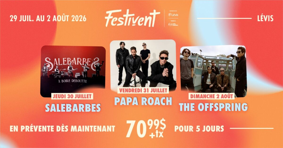La 43e édition du Festivent de Lévis approche, alors que trois têtes d’affiche sont dévoilées pour donner un avant-goût de la fête qui aura lieu du 29 juillet au 2 août 2026. L’équipe du Festivent de Lévis est très heureuse de pouvoir annoncer aujourd’hui que le Parc Champigny accueillera entre autres cette année Salebarbes, Papa Roach et The Offspring. Avec la programmation habituelle de montgolfières et d’attractions diverses qui plaira à toute la famille, cette édition saura sans doute marquer les esprits !