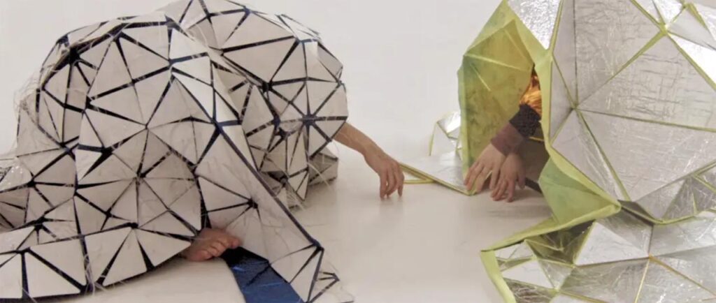 C’est un rituel en trois parties qui explore le soft power de l’éphémère. Entre carapaces textiles et organes souples, architectures de films de savon et reflets miroirs, la performance-installation se déploie dans une atmosphère immersive et sensorielle où les formes tremblent, se dissolvent et réapparaissent.