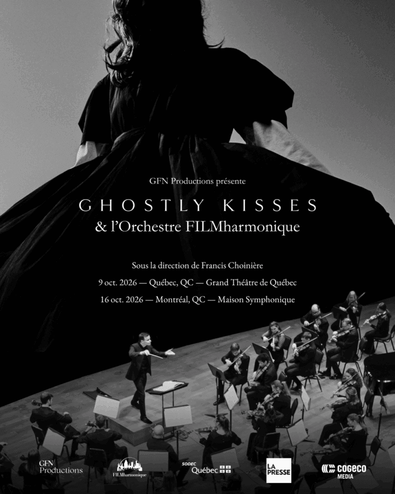 Sous la direction inspirée de Francis Choinière, qui signera également les arrangements, le spectacle proposera une relecture des pièces phares de Ghostly Kisses tout en dévoilant de nouvelles œuvres issues de leur album à paraître en 2026. Ce projet unique, présenté par GFN Productions et l’Orchestre FILMharmonique, plongera le public dans un univers où les chansons du duo, portées par la voix envoûtante de Margaux Sauvé, se réinventeront dans une version symphonique enveloppante et cinématographique.