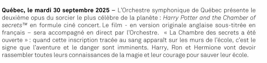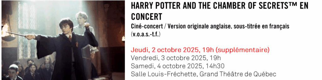 HARRY POTTER AND THE CHAMBER OF SECRETS TM EN CONCERT Partager : Cliquez pour partager sur Facebook(ouvre dans une nouvelle fenêtre) Facebook Cliquer pour partager sur X(ouvre dans une nouvelle fenêtre) X Cliquer pour envoyer un lien par e-mail à un ami(ouvre dans une nouvelle fenêtre) E-mail Harry Potter and the Chamber of secrets ( Supplémentaire)Date27 juin 2025Par rapport àCommuniqués de presseDes événements éblouissants au Grand ThéâtreDate27 juin 2025Par rapport àCommuniqués de presseSUPPLÉMENTAIRE POUR LE CINÉ-CONCERTDate11 mai 2024Par rapport àCommuniqués de presse