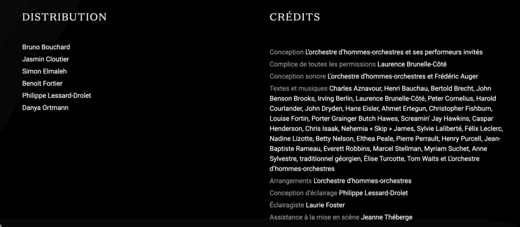Comme toujours, la musique est au cœur du geste. À l’image de la mémoire, qui accumule, conserve et tisse des liens parfois logiques, parfois fortuits, la proposition explore un répertoire très éclectique, où L’orchestre d’hommes-orchestres érige un théâtre-courtepointe tissé d’élans avec le désir d’embrasser nos legs à pleine bouche et de fêter ce qui advient.