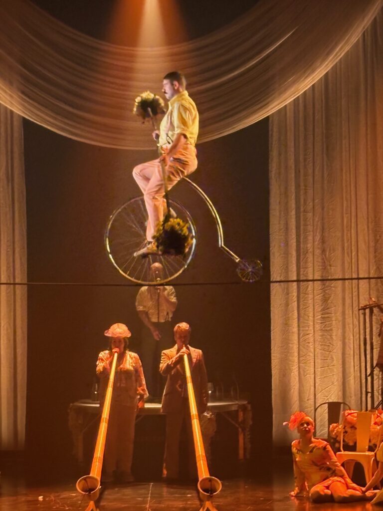 Un numéro étonnant sur un fil avec un vélo. Musique spéciale pour l’événement.