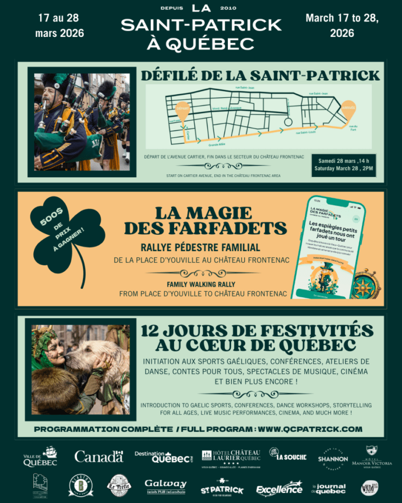 En cette journée de la Saint-Patrick, le coup d’envoi est donné pour les nombreuses festivités dans la ville de Québec ! La programmation culturelle gratuite offerte dès aujourd’hui est très riche pour petits et grands. Les divers spectacles qui animeront les quartiers de la vieille capitale seront accompagnés d’activités sportives, de danse, historiques ainsi que des conférences, qui représenteront bien l’héritage culturel irlandais, en plaisant à toute la famille ainsi qu’aux passionnés de l’histoire. La clôture de ces célébrations aura lieu le 28 mars avec l’immanquable Défilé de la Saint-Patrick de Québec, qui attire chaque année plus de 50 000 visiteurs.