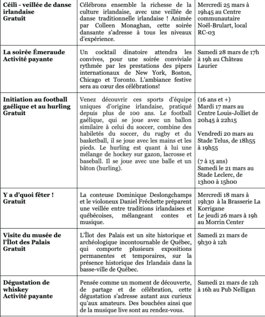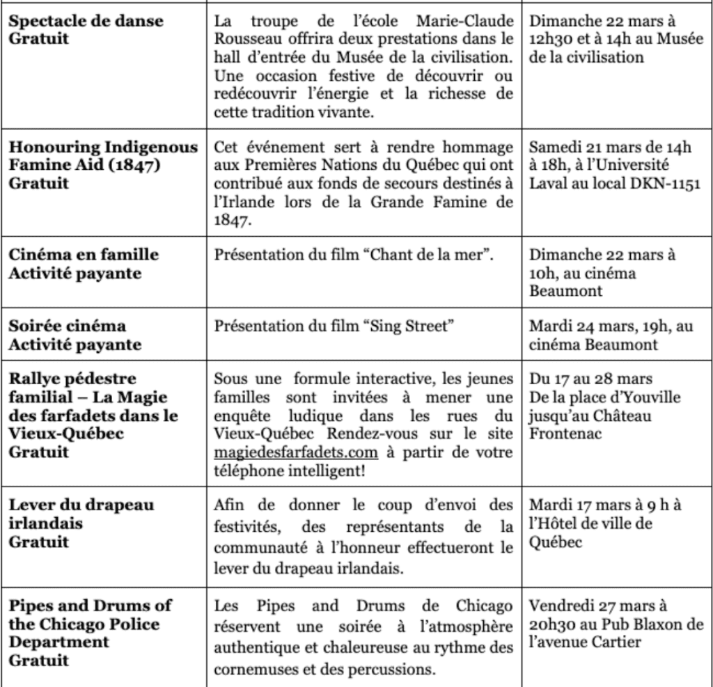 Rappelons que de nombreuses autres activités égayeront la ville tout au long de la semaine pour faire la part belle au legs irlandais de Québec.