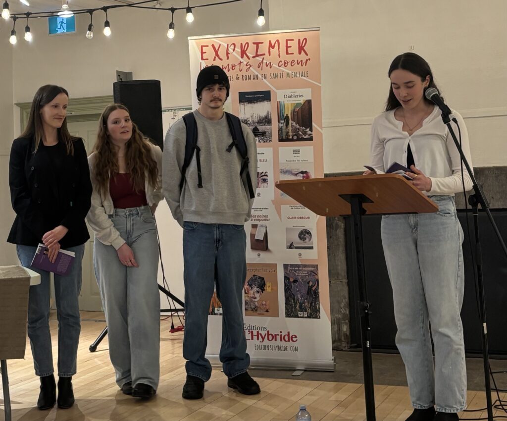De gauche à droite : Gabrielle Côté, ancienne étudiante nous a parlé de diversité, Anaïs Langlois a lu sur le métier d’enseignante, Émile Boucher a lu un court extrait, et Anabelle Guay a lu un extrait sur la souffrance.