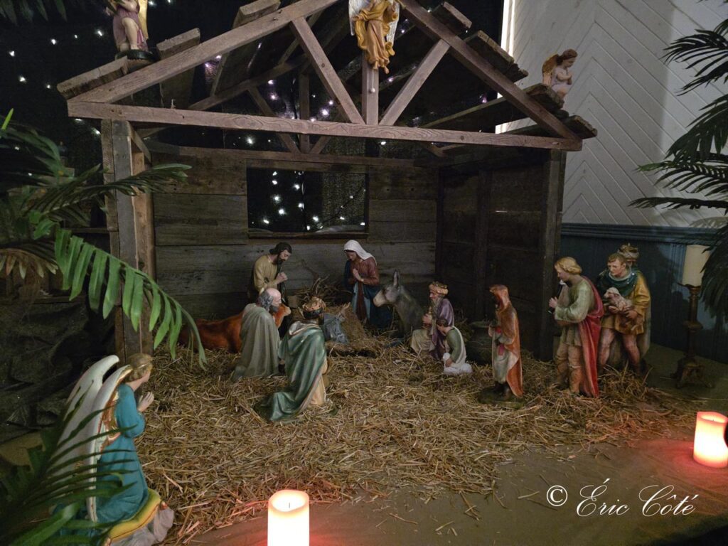Dans l’église, M. le curé nous accueille et nous raconte l’histoire de la crèche et du sapin au Québec.  Jusqu’à aujourd’hui, à l’intérieur de l’église, l’ensemble vocal des Gospangels nous offrent un spectacle de chants de Noël.  Et des surprises dans quelques maisons : Magasin Général où nous pouvons acheter des bonbons en plus de cadeaux; la maison de l’avare; trois autres maisons avec des kiosques d’artisans et produits du terroir; la beignerie où j’ai pris un bon chocolat chaud à la vanille française; le chalet où on peut manger et se réchauffer; la boulangerie où vous pourrez vous acheter du pain ou des gâteries comme des chocolatines ou encore des galettes à la mélasse (Personnellement je me suis acheté des galettes à la mélasse et un pain de fesse blanc); l’atelier de jouets et plusieurs autres belles surprises.  Et surtout… ne pas oublier de prendre une photo avec le Père Noël et sa charmante épouse, la Mère Noël.