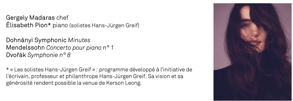 Symphonic Minutes de Dohnányi, de brèves miniatures orchestrales aux couleurs contrastées et à l’inventivité éclatante. Suivra le Premier concerto pour piano de Mendelssohn, une partition solaire qui est une déclaration d’amour à une jeune pianiste qui avait subjugué le compositeur. Et pour clore ce programme, une joyeuse note optimiste avec la Huitième symphonie de Dvořák qui incarne la joie et la richesse de la culture tchèque, tant par ses mélodies enjouées que par son orchestration évocatrice.