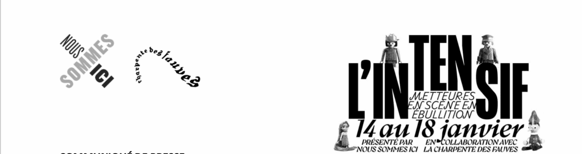 La compagnie de théâtre Nous sommes ici, en collaboration avec la Charpente des fauves, annonce la première édition de L’Intensif – metteur·es en scène en ébullition, un tout nouvel événement dédié à l’art de la mise en scène. Dans l’esprit du Kino, du Jamais Lu et de Osez!, cette initiative unique dans le genre mettra en lumière ce travail de l’ombre tout en offrant un terrain de jeu propice à l’expérimentation et à l’audace. Au total, 4 artistes de la mise en scène, aguerris ou de la relève, seront jumelés à des équipes de création et présenteront le fruit d’un travail intensif de 3 jours devant public et panel de pairs.