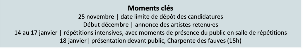 Le 18 janvier en après-midi, le public sera invité à venir découvrir les propositions lors d’une présentation publique à la Charpente des fauves où l’ensemble des propositions s’enchaîneront. Un panel de metteur·euses en scène émérites alimenteront ensuite la discussion et les réflexions, analysant les forces et influences. Nul remise de prix, mais l’assurance de mieux faire connaître un travail où la portée des choix est déterminante dans l’adaptation – et l’appréciation – des pièces au théâtre.