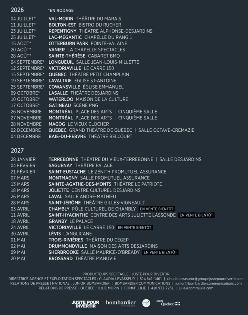 Juste pour divertir annonce aujourd’hui la tournée de Pierre Verville, qui montera sur scène à compter de l’été 2026 avec un spectacle intitulé Pour une dernière voix. On pourra le voir à la Cinquième Salle de la Place des Arts les 26 et 27 novembre et à la Salle Octave-Crémazie du Grand Théâtre de Québec le 2 décembre.