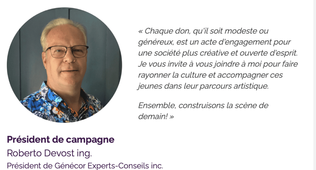 Premier Acte, diffuseur dédié à la diffusion et au développement de la relève théâtrale québécoise, lance sa campagne annuelle de financement. Celle-ci se tiendra sous la présidence d’honneur de monsieur Roberto Devost, président de Génécor Experts-Conseils inc., et vise un objectif de 100 000 $ !