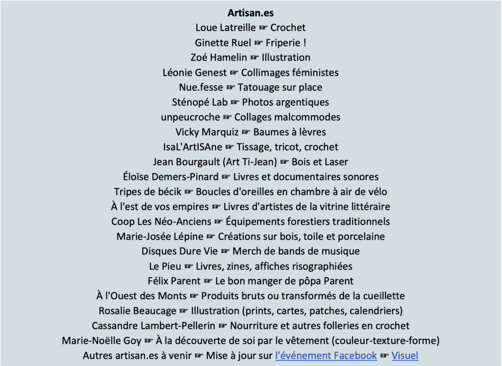 La Charpente des fauves annonce la tenue de son tout premier marché de Noël, samedi le 6 décembre, de 10h à 17h. Alliant art et audace, la presque totalité de la bâtisse sera habitée et transformée par une vingtaine de kiosques et autant d’artistes résident.es ou ami.es du lieu culturel. Les traditions bien vivantes de l’artisanat – crochet, bois, boucles d’oreilles – côtoieront celles plus alternatives du tatouage, zine, collage malcommode, documentaire sonore et conseil vestimentaire. Dans une ambiance festive, nourriture maison, vin chaud et Père Noël ajouteront au bonheur de faire des acquisitions uniques, tout en (re)découvrant des artistes locaux.