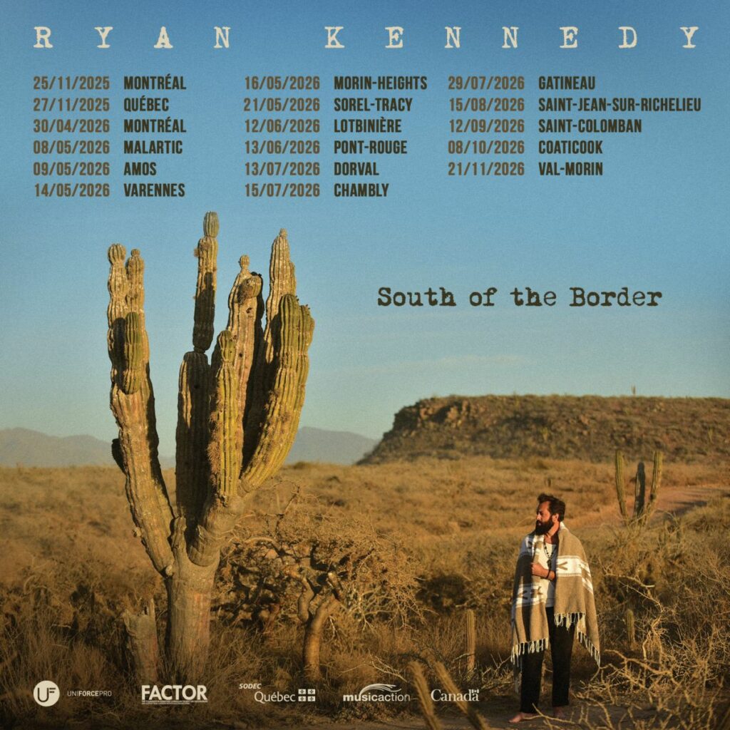 Après avoir conquis son public une énième fois avec ses trois derniers singles, l’auteur-compositeur-interprète Ryan Kennedy dévoile enfin son plus récent album : South of the Border. Deux soirées de lancement sont à l’agenda la semaine prochaine, à Montréal et à Québec, pour bien amorcer la tournée. Celle-ci fera voyager les nouvelles pièces de Ryan Kennedy partout à travers la province en 2026.