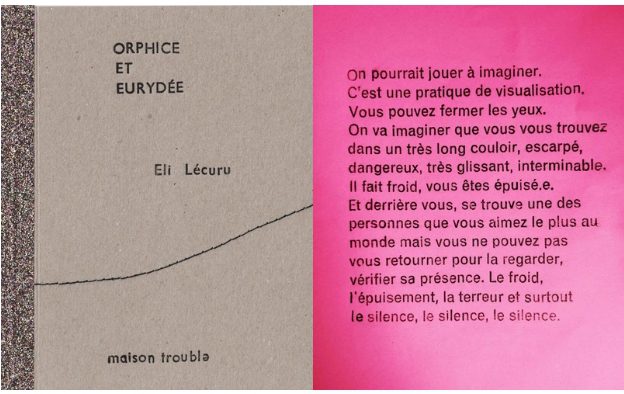 Les éditions maison trouble nous offrent ici un magnifique petit livret, cousu et aux teintes bi-chromatiques rose/gris (comme on les aime). Le texte de Eli Lécuru s’intéresse en définitive à une théorie qu’il a développé, celle de la mise en scène des conditions de l’échec par la méta-structure (en s’inspirant du mythe de Orphée et Eurydice), considérant que en réalité Eurydice n’aurait jamais été derrière Orphée lors de sa remontée des enfers (dans le but de la sauver), ce qui le plaçait déjà en position d’échouer. Il s’inspire également de l’histoire tragique de la chanteuse Amy Winehouse, ayant rapidement été placée sur un piédestal au début de sa carrière d’artiste très talentueuse, et l’ayant également placé dans la position qui l’aura amené à perdre le contrôle de sa vie (pression médiatique, entre autre – voir le documentaire Amy qui relate l’histoire de cette personne aussi talentueuse qu’hypersensible). L’auteur termine également sur ces questions : qu’est-ce qui tue/porte/reste dans le regard ? Qui regarde quoi et quel pouvoir cela créé dans le récit ?