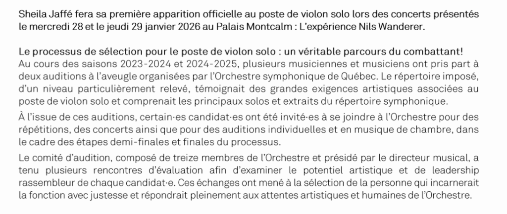 Sheila Jaffé fera sa première apparition officielle au poste de violon solo lors des concerts présentés le mercredi 28 et le jeudi 29 janvier 2026 au Palais Montcalm : L’expérience Nils Wanderer.