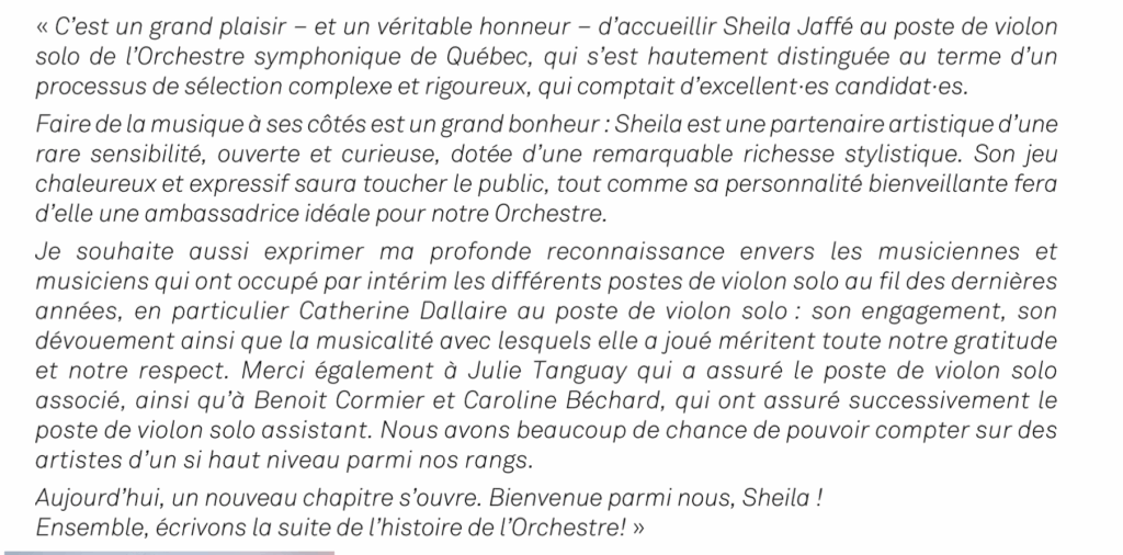 L’Orchestre symphonique de Québec a l’immense plaisir d’accueillir Sheila Jaffé au poste de violon solo. La musicienne canadienne s’est hautement distinguée au terme d’un processus de sélection complexe et rigoureux. Son arrivée représente la première nomination et entrée en poste d’un violon solo au sein de l’Orchestre symphonique de Québec, depuis maintenant 8 ans. C’est un événement marquant, à l’échelle de l’histoire de notre Orchestre, qui fêtera bientôt ses 125 ans.