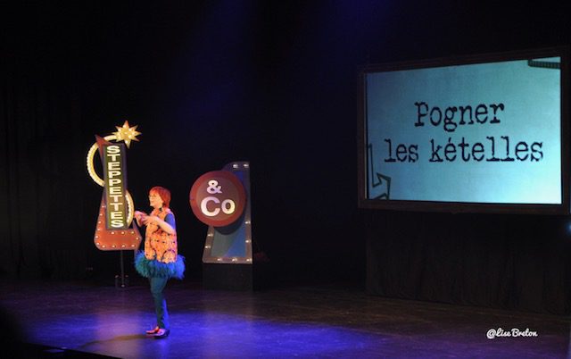 Dans un décor illuminé comme à Las Vegas, Chantal arrive dans un ensemble coloré avec une longue cap par-dessus ses autres vêtements. Elle a remercié son partenaire la FADOQ, et elle a vérifiée l’âge des gens. Elle était bien contente de constater qu’il y avait aussi des spectateurs dans la trentaine et quarantaine. Elle a même expliqué aux plus jeunes les expressions d’autrefois pour les comparer à un autre terme que l’on emploie aujourd’hui.