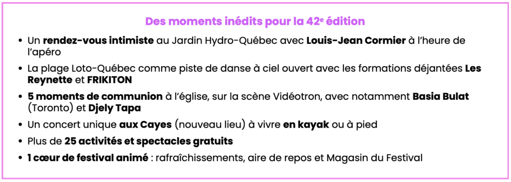 L’équipe du Festival de la chanson de Tadoussac, présenté par Vidéotron, dévoile la programmation complète de sa 42ᵉ édition. Du 11 au 14 juin 2026, plus de 50 rendez-vous musicaux animeront le village avec des propositions éclectiques où se rencontrent artistes établi·e·s et voix émergentes d’ici et d’ailleurs. Aux noms déjà annoncés de Lou-Adriane Cassidy et Thomas Fersen (France), s’ajoutent notamment Pierre Lapointe, Sarahmée, Gab Bouchard, Arielle Soucy, ANYMA ORA’ (Wendake) et Alphonse Bisaillon. De plus, des groupes mythiques tels que We Are Wolves, Lemon Bucket Orkestra (Toronto) et Les Lunatiques feront danser la foule. Durant ces 4 jours de festivités, 20 lieux emblématiques de Tadoussac – dont plus de la moitié en plein air – seront investis pour faire vivre aux mélomanes une expérience inoubliable, aussi unique et séduisante que les paysages nord-côtiers.