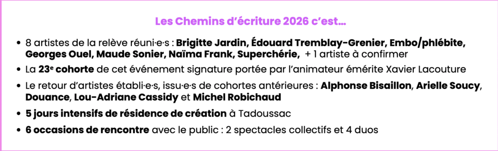 Pour Myriam Sénéchal, directrice générale du FCT, la magie du Festival repose sur un équilibre précieux : « La qualité de notre programmation paritaire, toujours variée et remplie de coups de cœur, combinée au caractère intimiste d’un événement à échelle humaine fait toute la différence. » Elle rappelle également l’importance des Chemins d’écriture, incubateur de talents unique en son genre, qui contribue au charme et à la notoriété du Festival, tant auprès des artistes que du public.