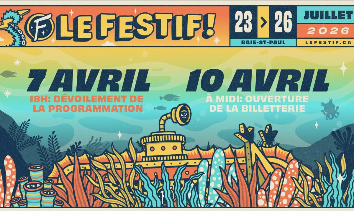 Le Festif! de Baie-Saint-Paul, l’un des événements les plus attendus de la scène musicale estivale, annonce aujourd’hui les dates clés entourant le dévoilement de sa programmation de sa 17e édition, qui se tiendra du 23 au 26 juillet 2026. Le grand dévoilement de la programmation aura lieu le 7 avril 2026 à 18h, en ligne via une diffusion Facebook […]