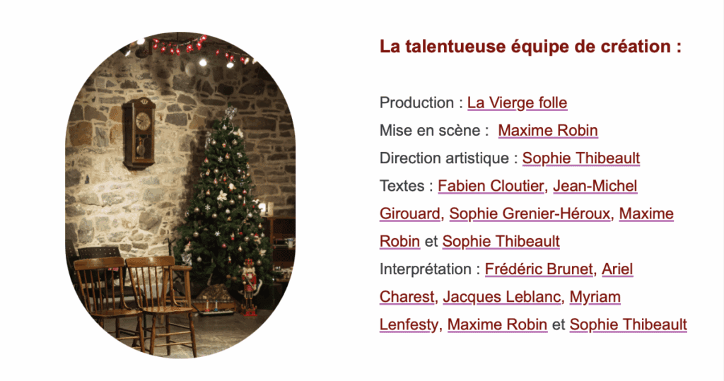 Cette année, nous avons rassemblé six de nos contes préférés des dernières années, livrés par six de nos interprètes préférés, et nous voulons les partager avec notre public préféré! Que vous soyez timide ou téméraire, un p’tit nouveau ou une vieille de la vieille, que vous aimiez rire ou être touché, on vous a divisé Québec en cinq parts, comme un gâteau. Venez dévorer les quartiers de votre ville, venez vous entendre être conté. Venez regarder Québec comme dans une boule à neige. Venez prendre part à la fête et vous réchauffer le cœur dans les voûtes de la Maison Chevalier pour les Contes à passer le temps!
