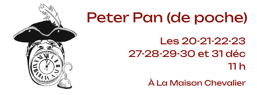 Dans les voûtes de la Maison Chevalier, en matinée, alors que tout est encore calme et que la neige tombe doucement sur le Vieux-Québec, venez-vous faire raconter l’histoire du garçon qui ne voulait pas grandir. Dans cette version du classique, qui oscille entre conte, théâtre et marionnette, vous rencontrerez l’attachante famille Darling, les redoutables garçons perdus, ainsi que les terribles pirates!