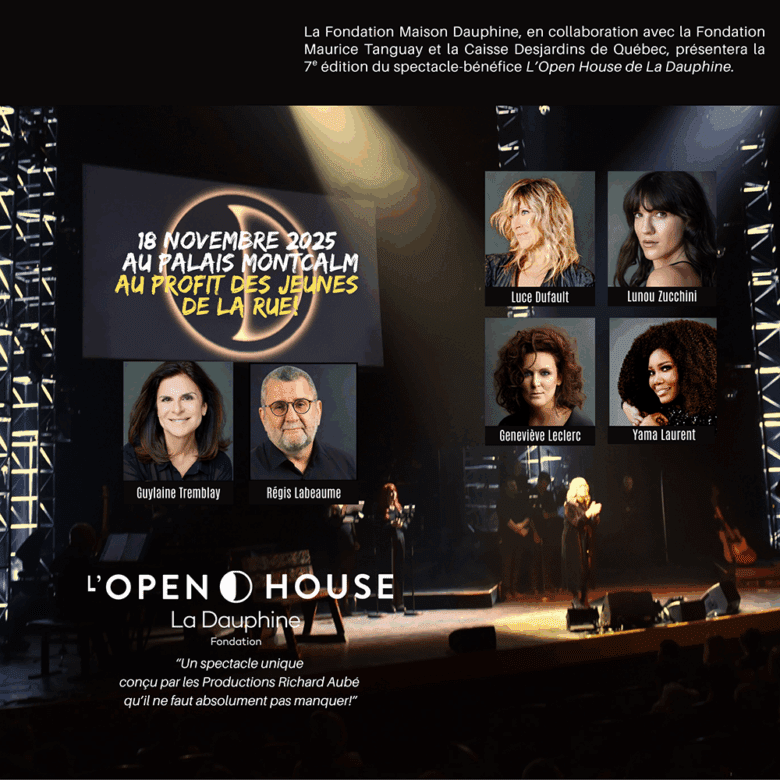 Incontournable pour la Fondation Maison Dauphine, L’Open House 2025 de La «Dauphe», comme l’appellent les jeunes, se tiendra au Palais Montcalm le 18 novembre à 20h. Pour cette soirée haute en émotions, le public aura droit à un spectacle réunissant Guylaine Tremblay, Régis Labeaume, Luce Dufault, Geneviève Leclerc, Lunou Zucchini et Yama Laurent, accompagnés d’un orchestre de 5 musiciens, de 4 choristes et d’un ensemble vocal de 25 personnes. Tous uniront leurs voix et leur talent pour une même cause : celle des jeunes en situation d’itinérance ou en grande difficulté.